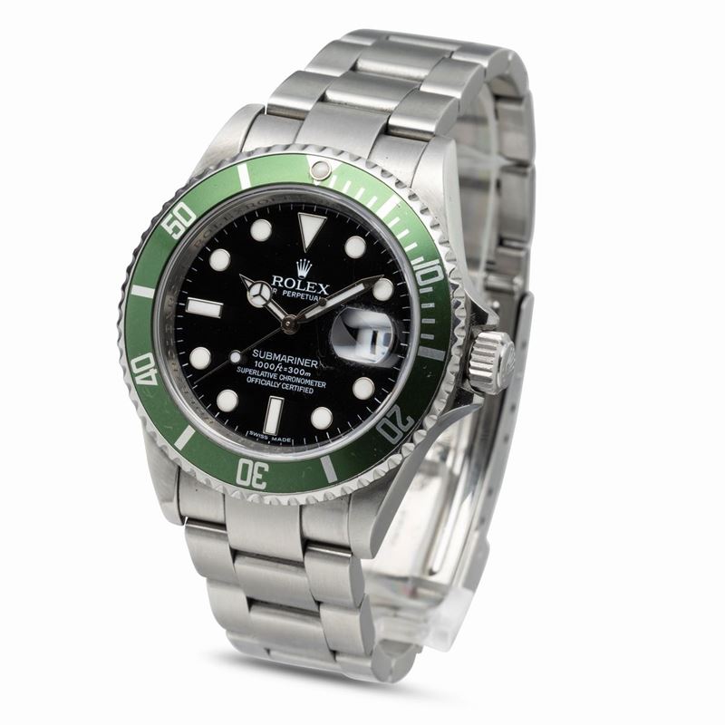 Iconic and sporty Submariner 16610 LV of the 50th anniversary, with green rotating bezel, stainless steel with black dial with luminescent hour markers