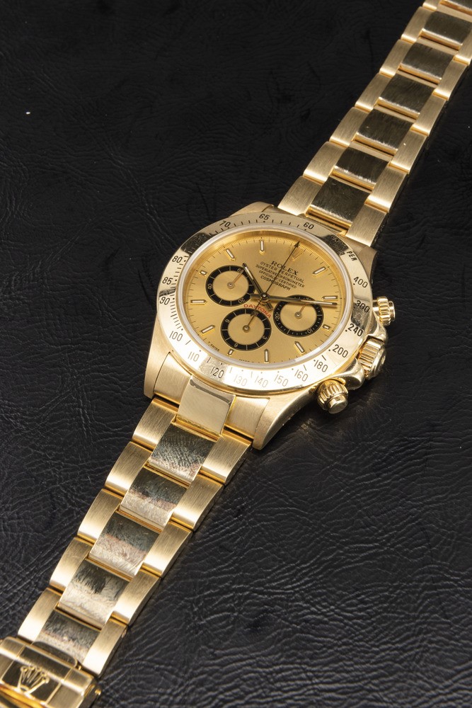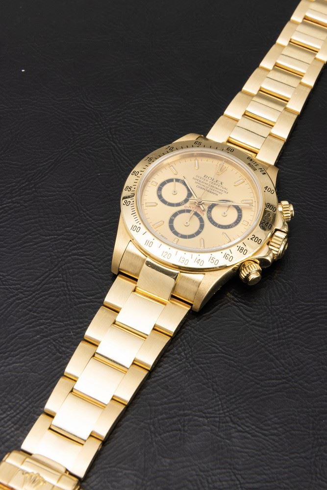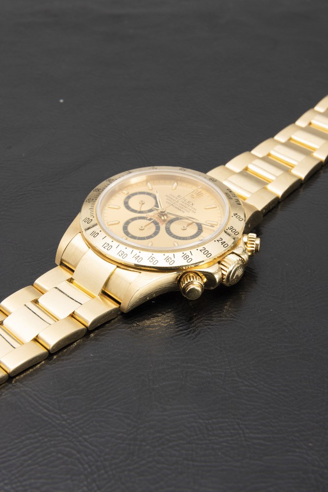 Iconic and valuable Cosmograph Daytona ref 16528 in 18k yellow gold with champagne dial and contrast black subdials