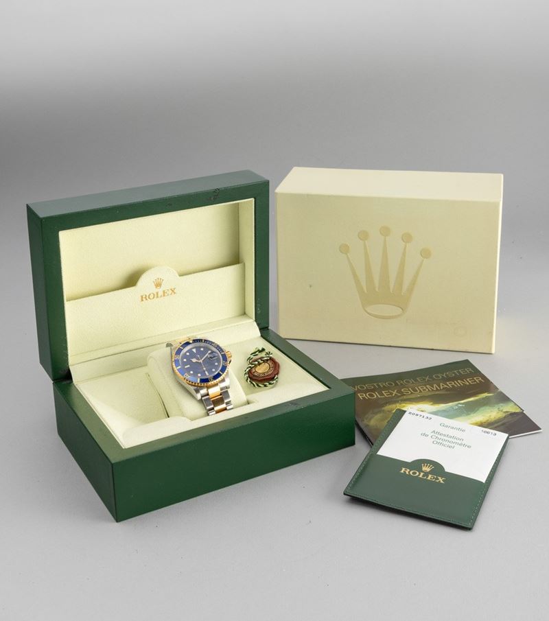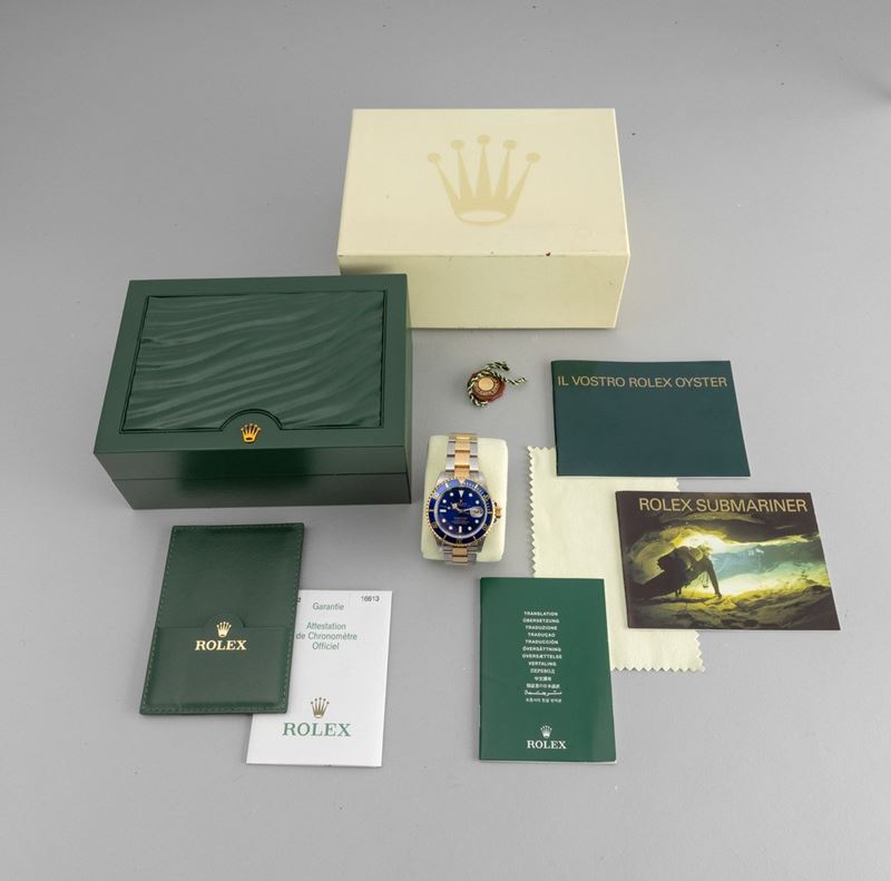 Submariner ref 16613 steel and gold, Blu Soleil automatic dial with date display, unidirectional revolving bezel, still present partial stickers also on the case back, box and warranty