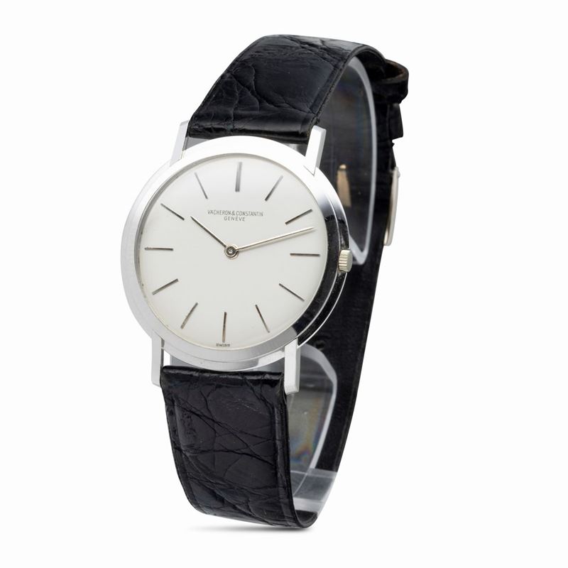 Elegant ultra-flat Patrimony with 18k white gold knife case, Silver dial with applied stick hour markers, manual winding
