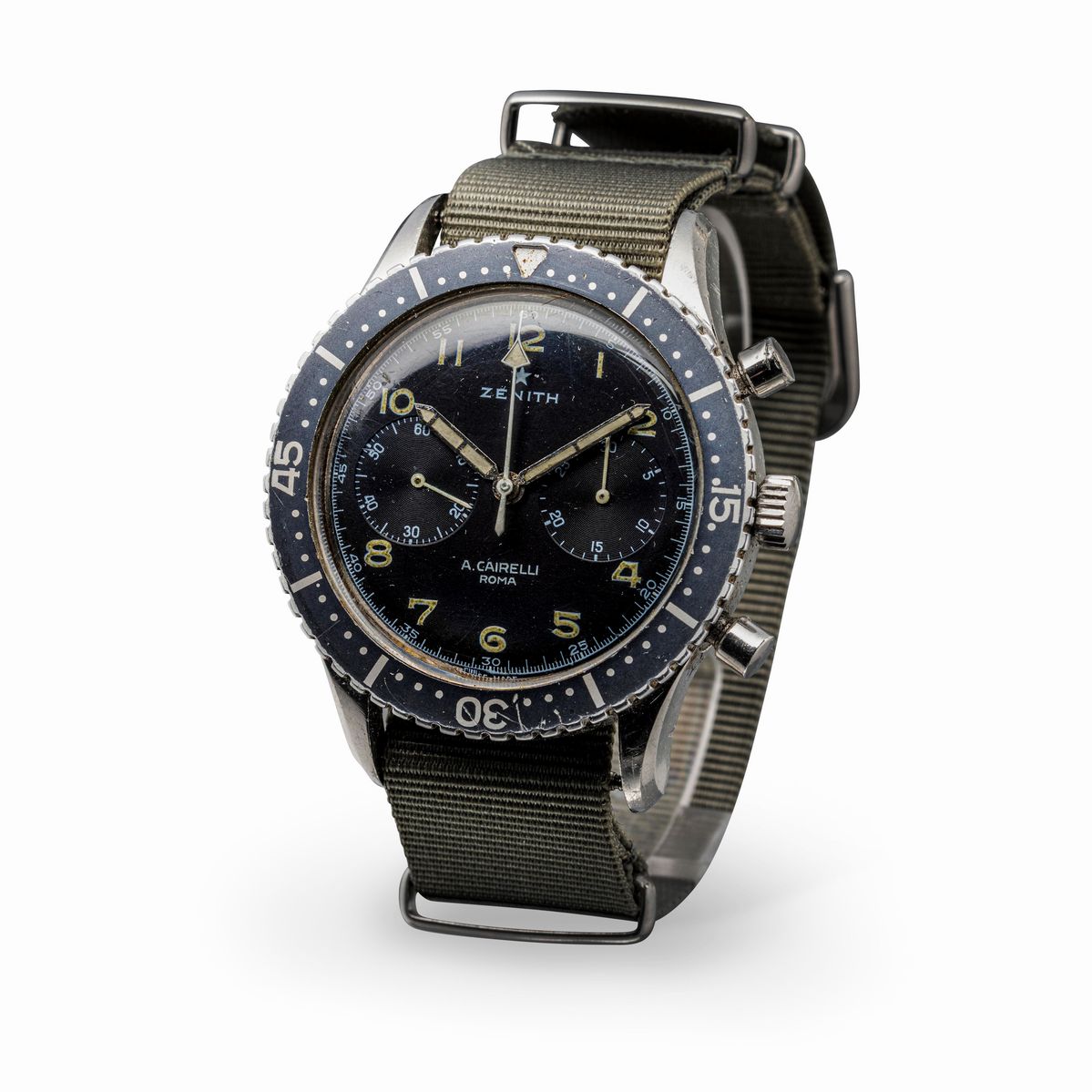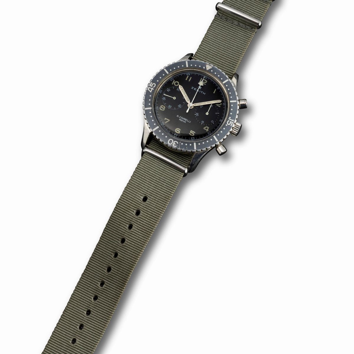 Rare and desirable Cairelli steel with polished black dial, bezel "Ghost" asssegnato AMI case back, rotating bezel with bright triangle Arabic numerals with tritium