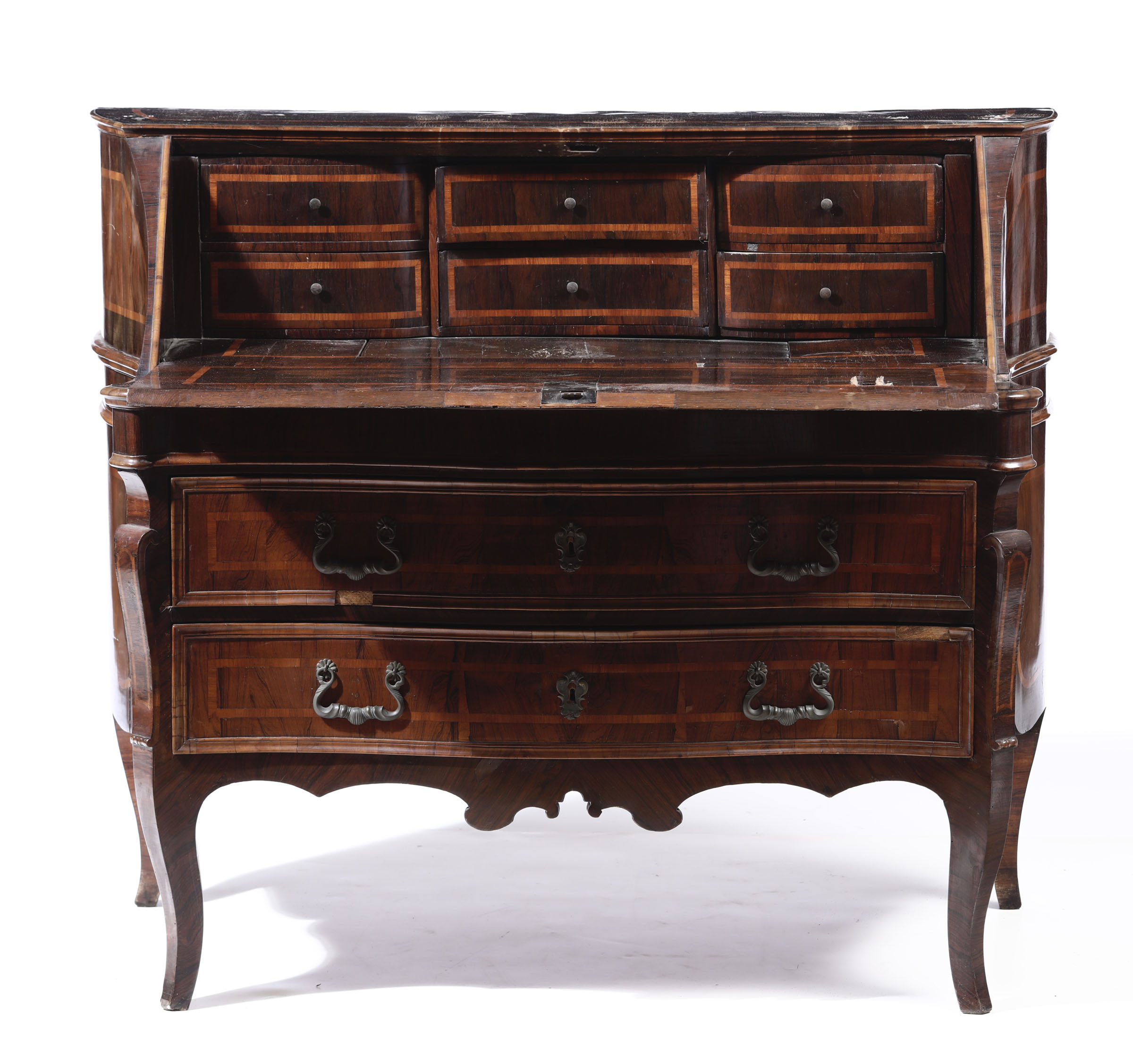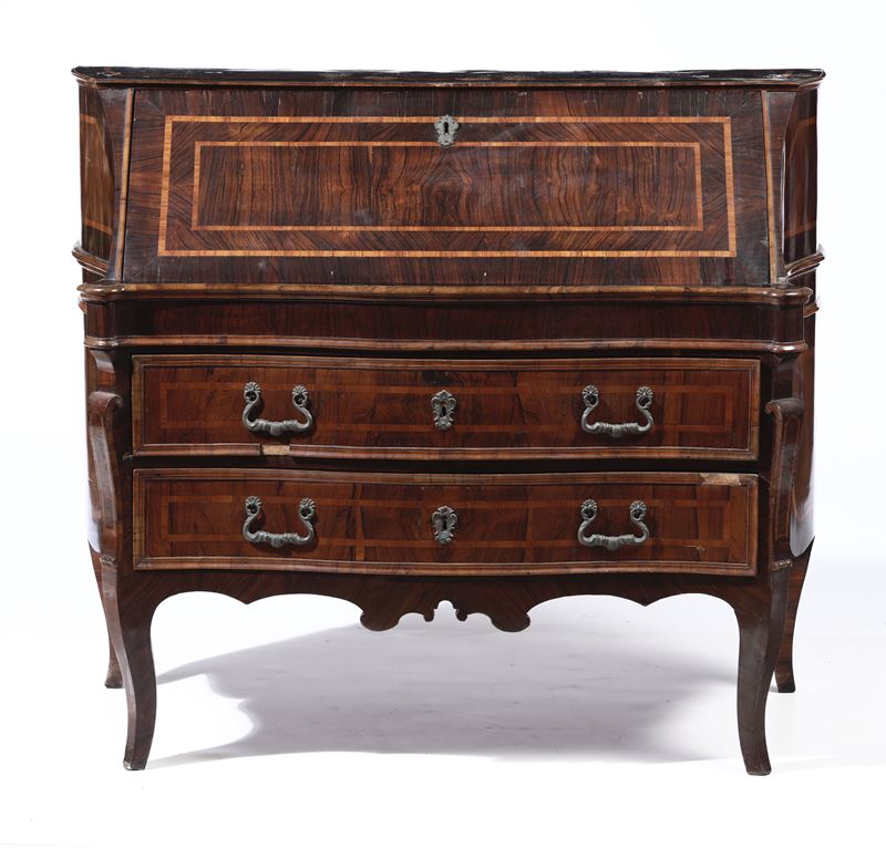 Cassettone a ribalta lastronato in palissandro e legno chiaro, Stato pontificio, XVIII secolo