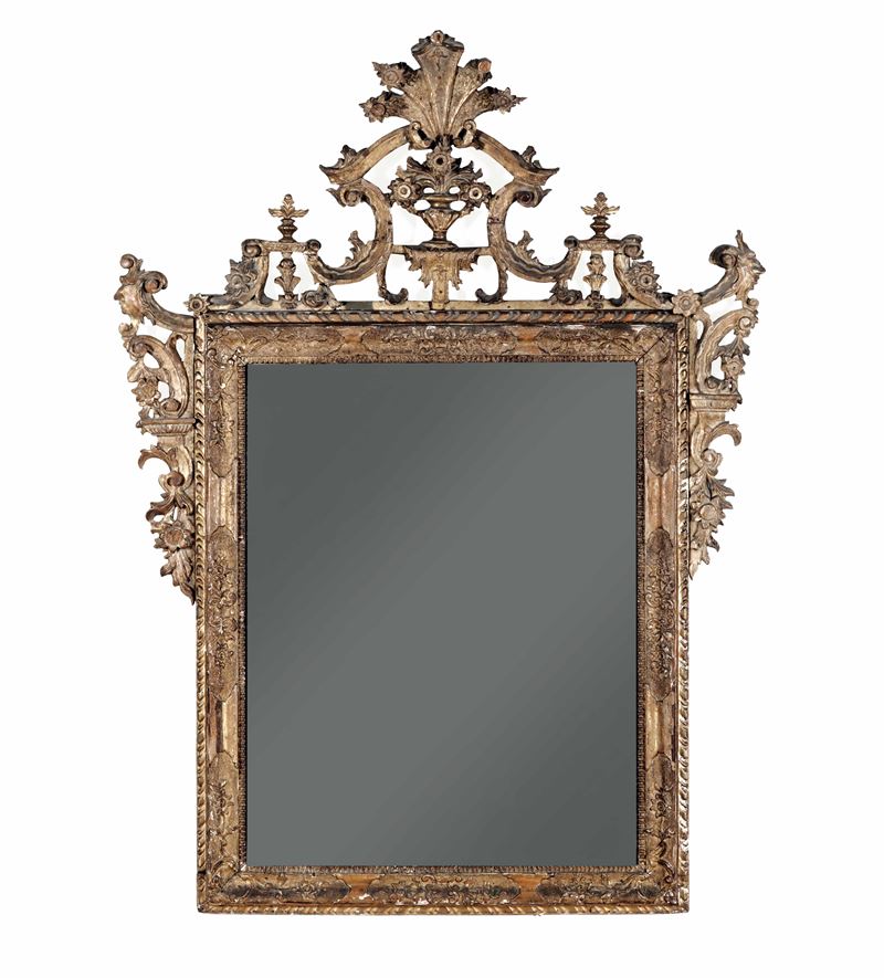 decori intagliati a motivo floreale, vegetale e volute; seconda specchiera in stile