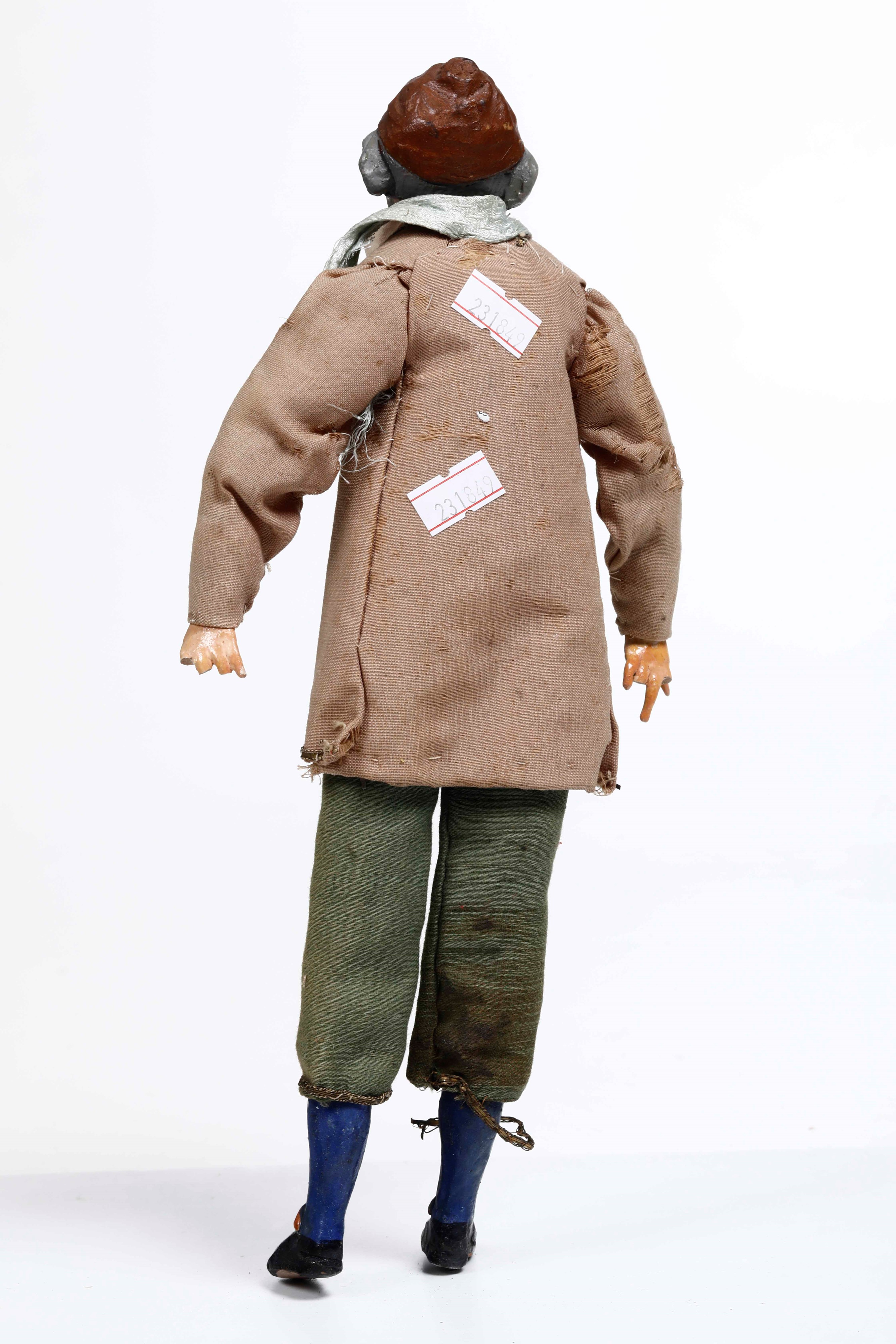 Mani e testa in terracotta. Occhi di vetro, abiti in tessuto.
