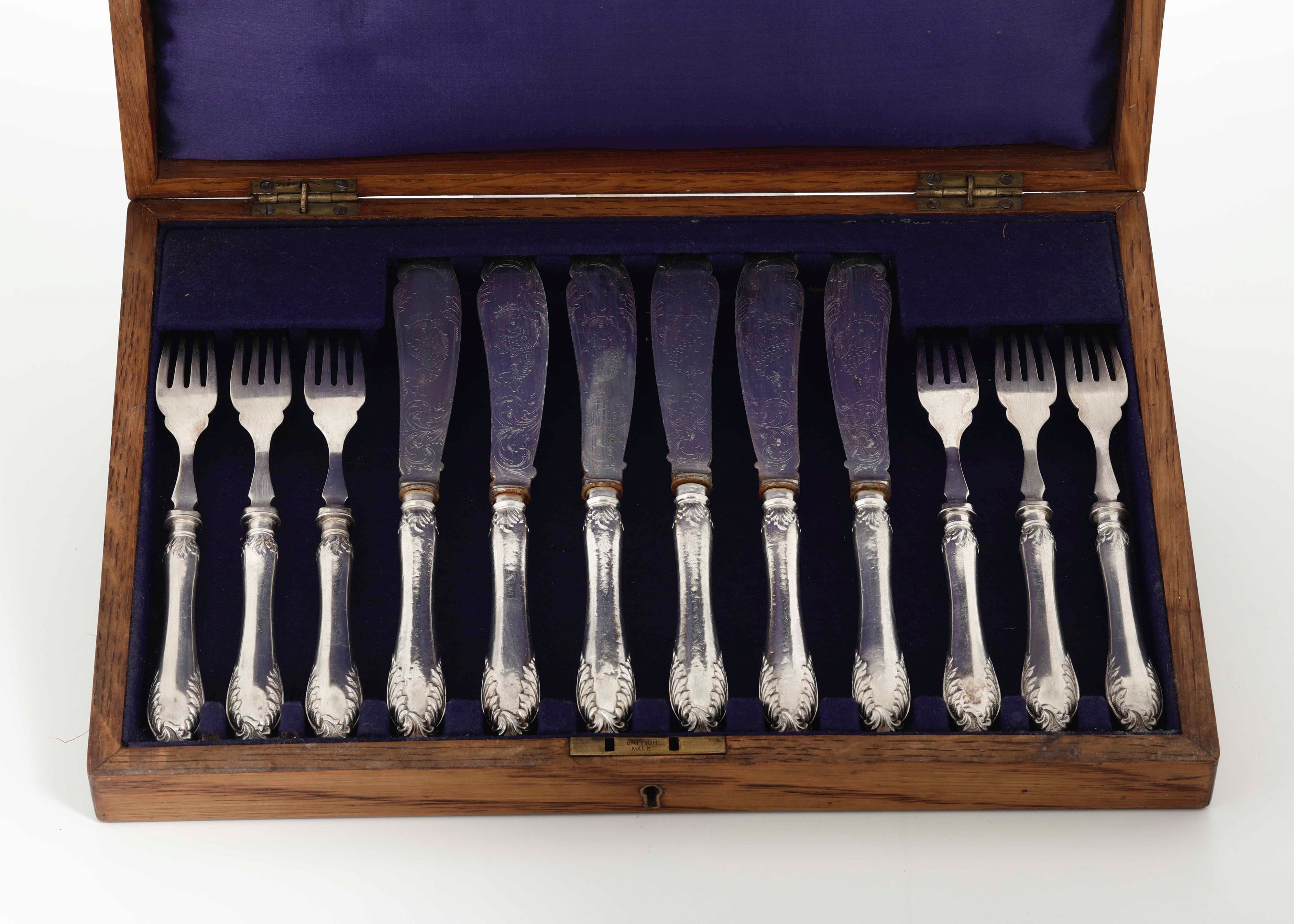 Servizio di posate da pesce in metallo argentato, entro scatola in legno. XIX-XX secolo
