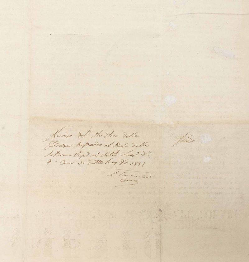 Dato in Roma il 19 dicembre 1851 dal pro Ministro delle Finanze Pontificio Angelo Galli, in previsione della prima emissione di francobolli pontifici avvenuta una dozzina di giorni dopo. Grande formato (cm 82,8 x 59). Importante manifesto di Storia Postale dello Stato Pontificio. Piccola mancanza di carta, ma insieme in ottimo stato.
