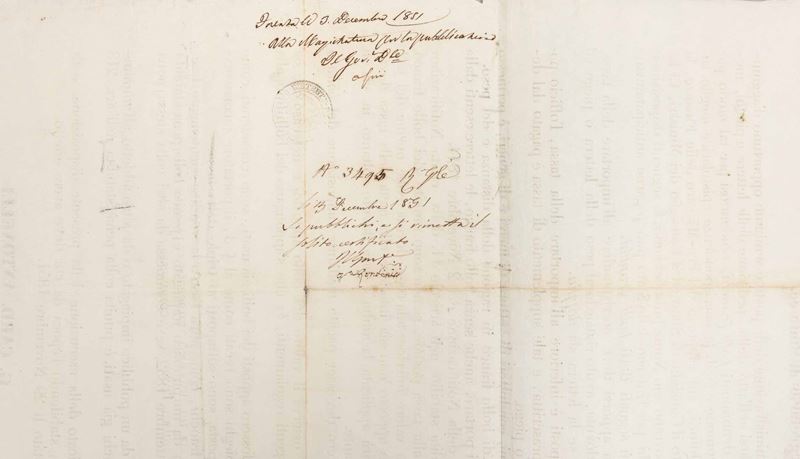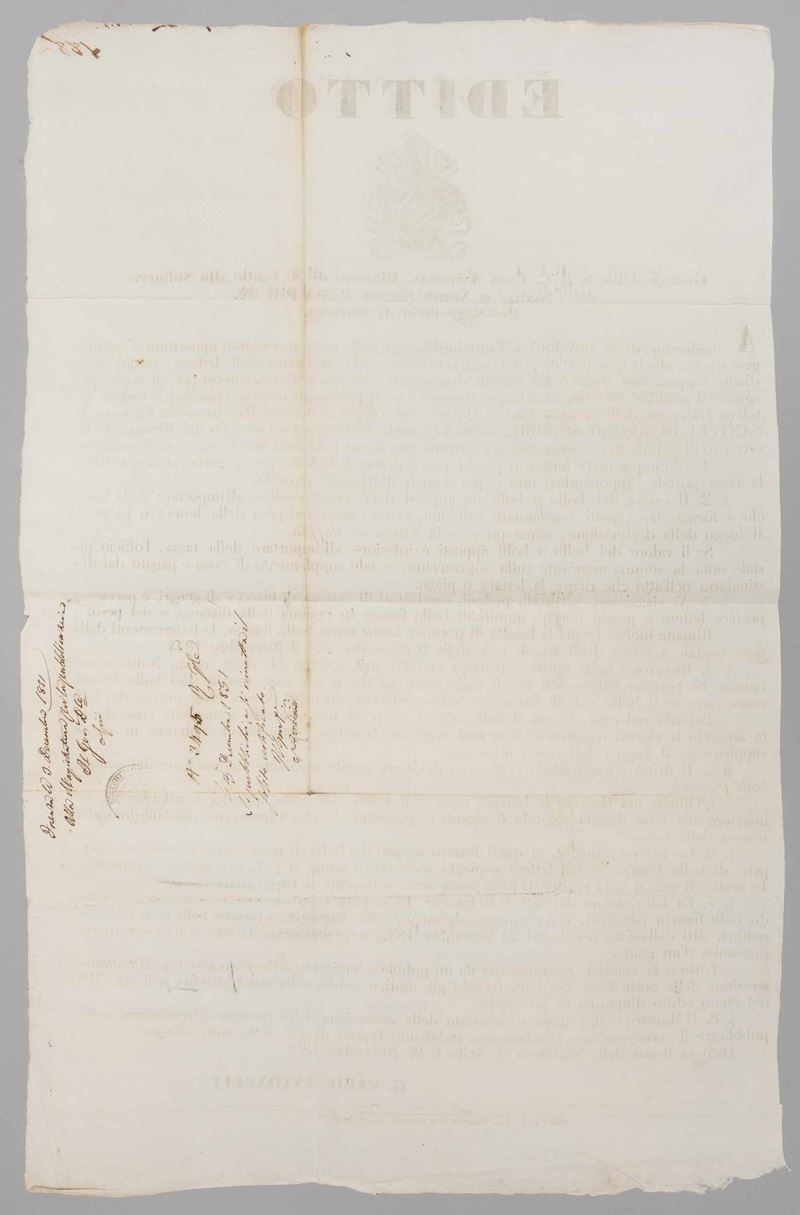 Recante le istruzioni per l’affrancatura, il trasporto delle lettere, l’uso e la vendita dei “bolli franchi”, che sarebbero stati emessi poco più di un mese dopo (il 1° gennaio 1852). In ottimo stato (cm 66 x 43).