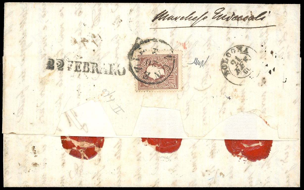 Affrancata con 5 soldi e, al verso, con 10 soldi (S. 30, 31). Segno di tassa di 60 centesimi, manoscritto “via di Padova e Bologna”, Contrariamente a quanto avveniva in Austria, le raccomandate venivano ricodificate e tassate come raccomandate. Molto bella, rara.