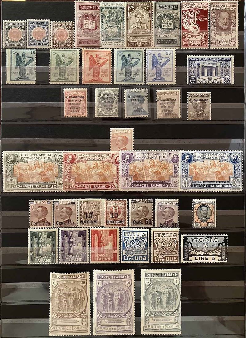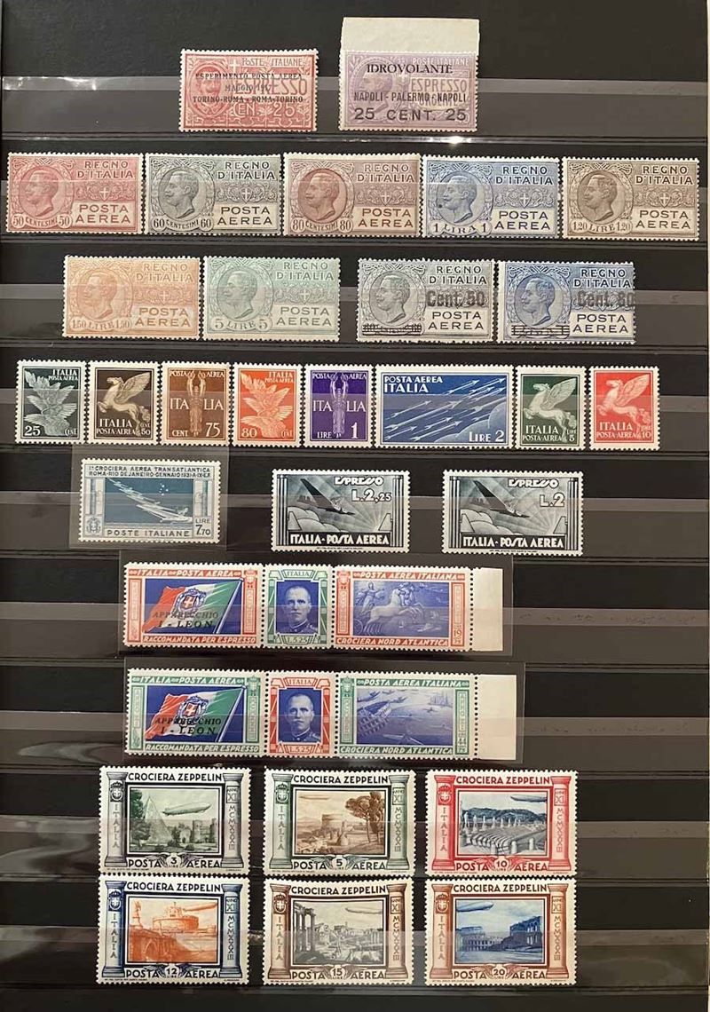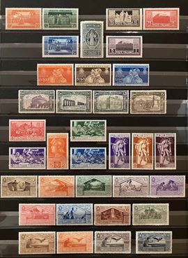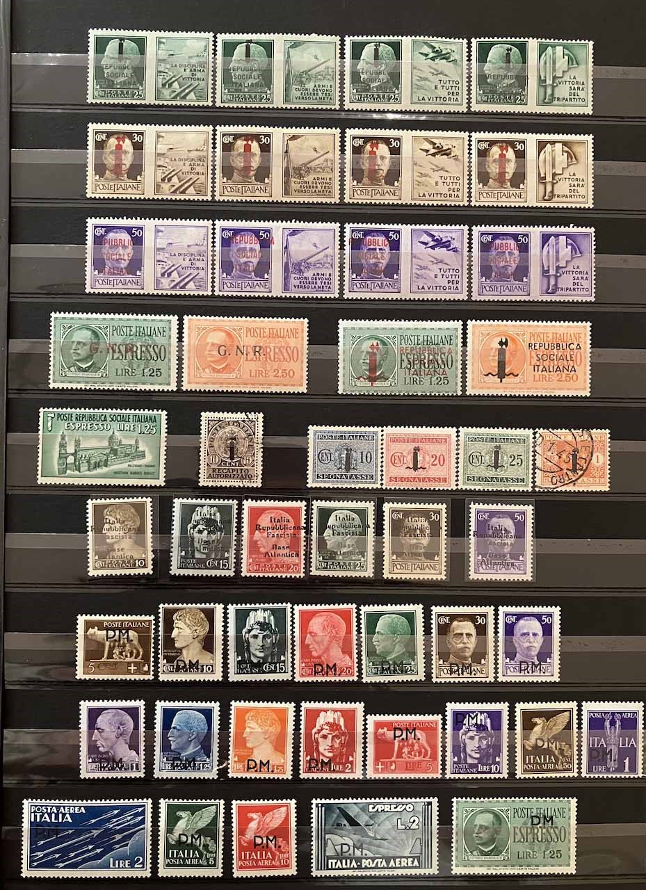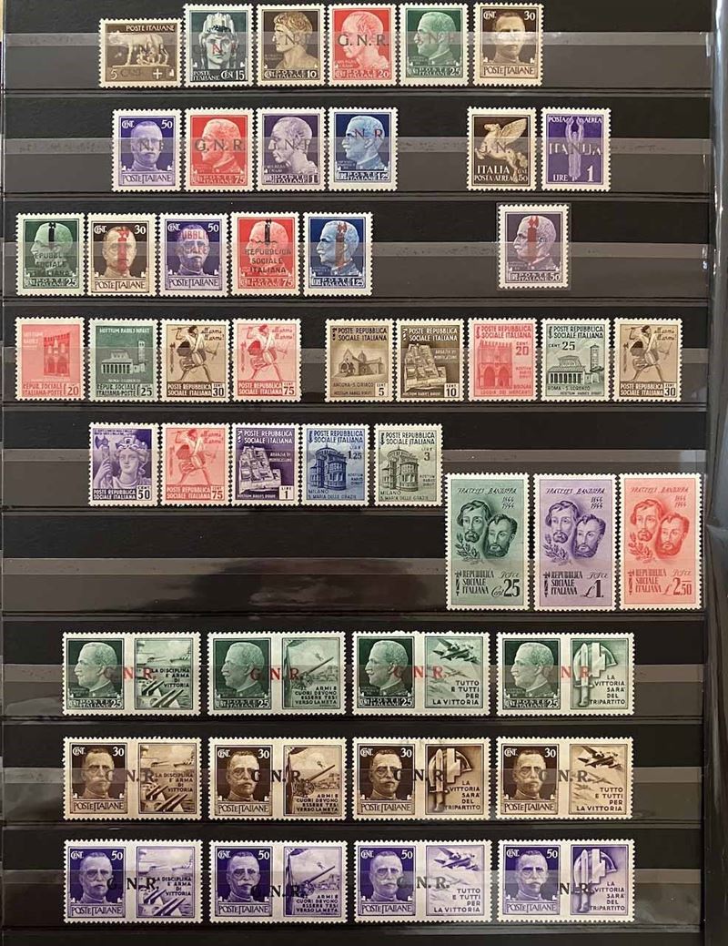 Con traccia di linguella e molte serie con gomma integra, in raccoglitore a taschine. Mancano diversi valori “BLP” e serie degli “Enti Semistatali”. Presenti valori “G. N. R.” e tredici certificati peritali. Inoltre, qualche emissione di Occupazioni, CLN, Fiume, ecc. Buona qualità, da esaminare, alto valore.