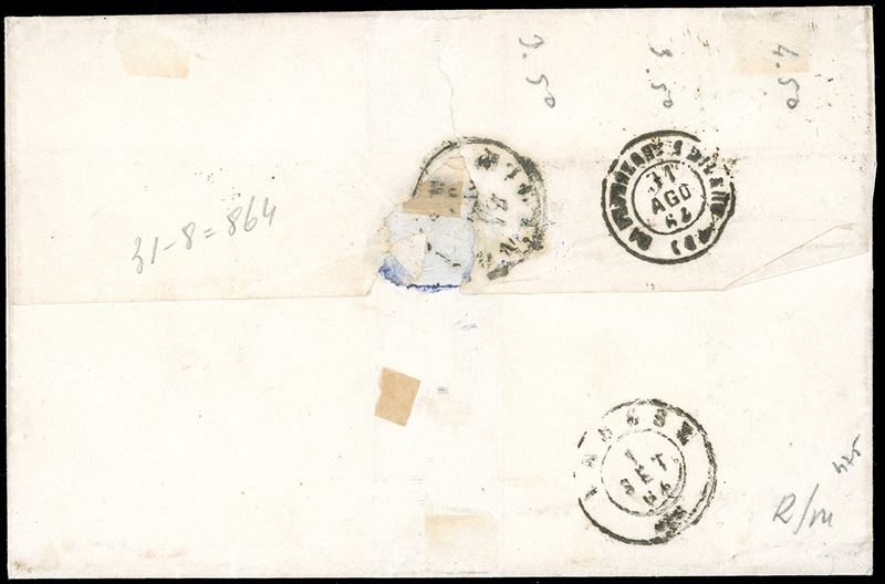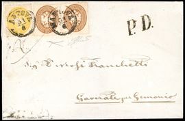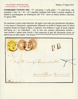 Affrancata in tariffa di doppio porto con 2 soldi giallo e due esemplari del 15 soldi bruno (S. 36, 40). Molto bella, affrancatura non comune. Certificato Bottacchi.