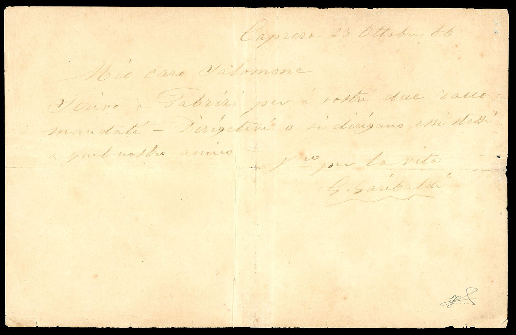 Diretto ad un amico del Generale Giuseppe Garibaldi e da lui manoscritto e firmato. Garibaldi, a Caprera dopo le battaglie della III Guerra d'Indipendenza, rientrò nell'isola per curarsi dopo la ferita ad una gamba, occorsa durante la battaglia di Bezzecca. Interessante documento.