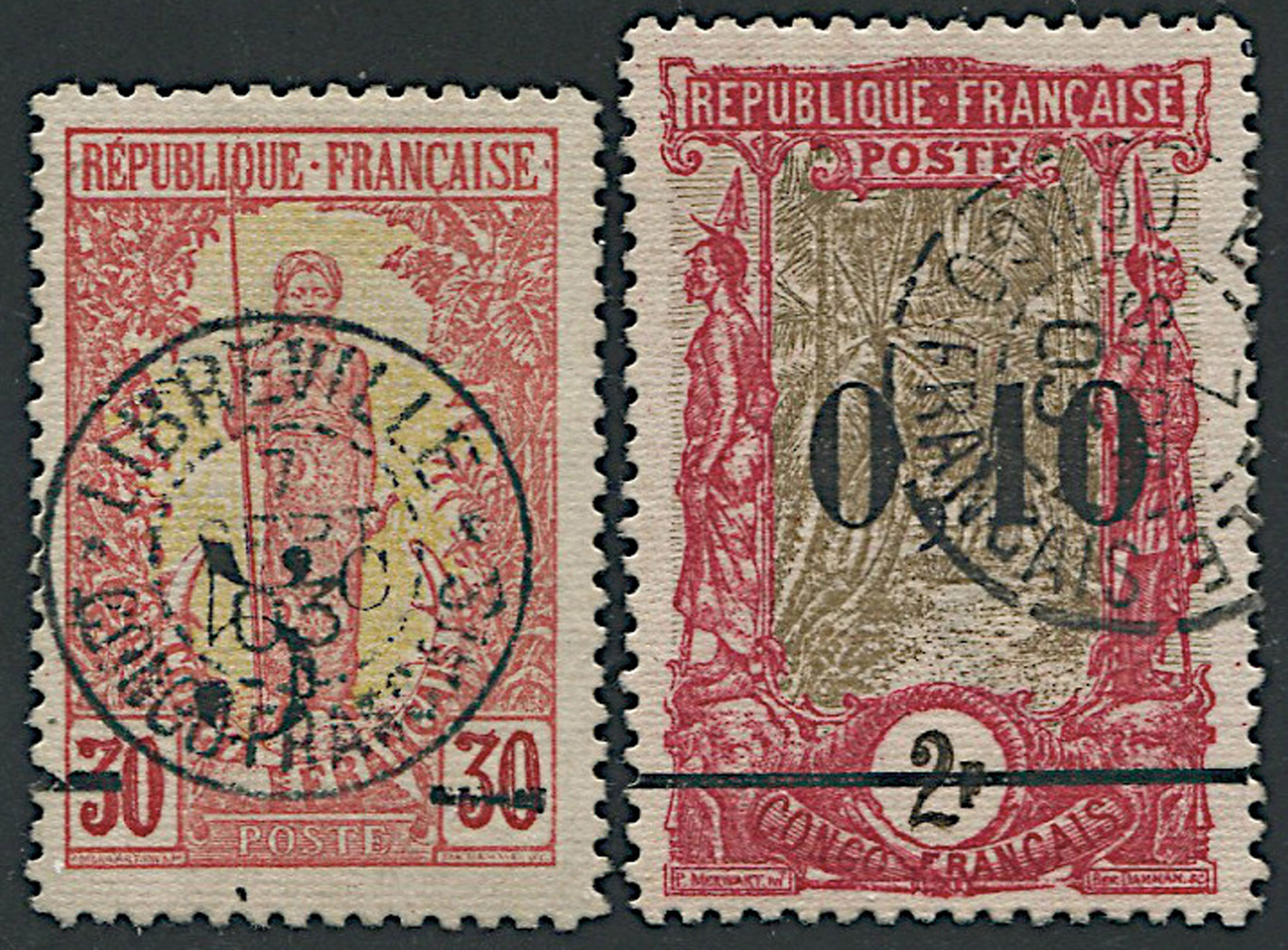 Overprinted with new value (Yv. 46/47 - Scott 52/53), cancelled by circular date stamp “Libreville - 7th September 03”. Scarce.