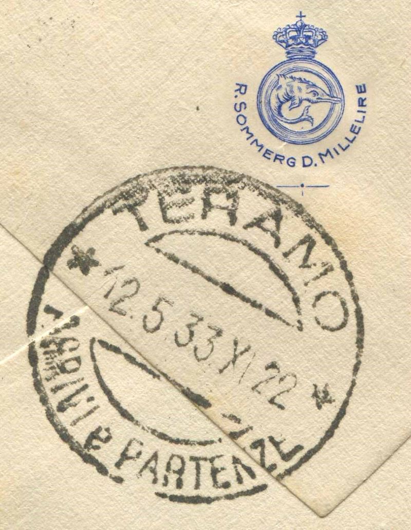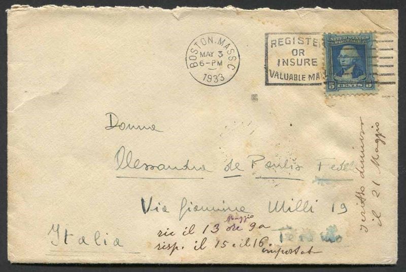 Busta da Boston, MA, per Teramo, affrancata con francobollo da 5 cent. di Stati Uniti (Yv. 305), inviata da un marinaio imbarcato a bordo del Sommergibile Domenico Millelire, in quei giorni ancorato a Boston, in attesa dell’arrivo degli aviatori comandati da Italo Balbo. Il Millelire diede il suo contributo di appoggio ai trasvolatori con il servizio di radioassistenza e soccorso in caso di ammaraggio. Stemma dell’unità al verso e bollo di arrivo a Taranto del 12 maggio. Non comune.