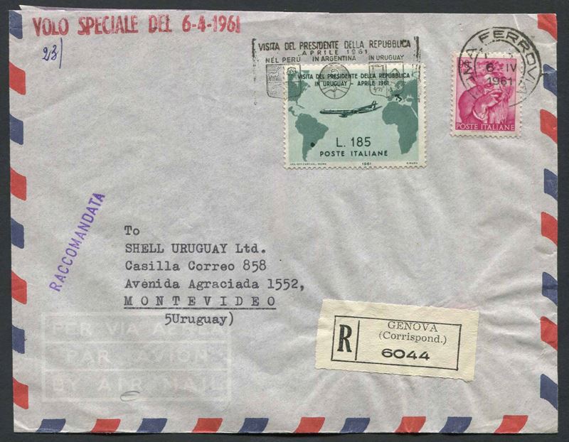 La serie dei tre francobolli su tre buste raccomandate in tariffa con, in più, l'esemplare da lire 205 rosa ricoperto parzialmente (S.918/921) su busta diretta a Lima. Bolli speciali in partenza e di arrivo. Il 205 rosa con certificato E. Diena.