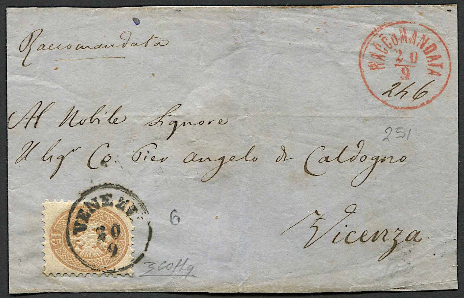 Affrancata in tariffa di raccomandata (5 + 10 soldi) assolta col francobollo da 15 soldi della V emissione (S. 45). A lato bollo in rosso “RACCOMANDATA” con data e numero di registro manoscritto. Al verso, bollo di arrivo a Vicenza del giorno. Certificato Colla. Rara corrispondenza viaggiata il giorno stesso dell’entrata in vigore della Convenzione Postale tra le due amministrazioni.