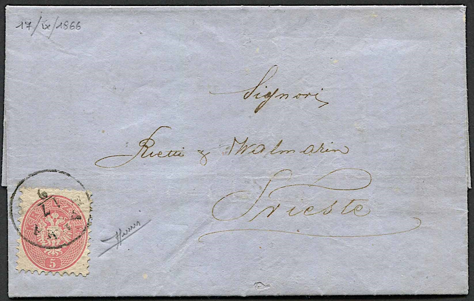 Affrancata con 5 kreuzer di Austria. Al verso, bollo di arrivo a Trieste del giorno dopo. La fortezza di Palma (ora Palmanova) fu liberata solo nel mese di ottobre 1866, dopo la firma del Trattato di pace di Vienna. Si tratta di un uso eccezionale e unico di un francobollo austriaco pochi giorni prima della consegna della città da parte delle truppe austriache agli italiani, consegna avvenuta il 13 ottobre dopo la pace di Vienna. Molto rara, Certificato Sorani.