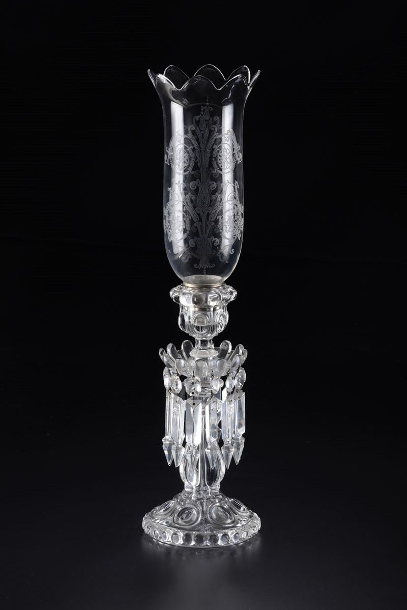 Su piede circolare a bugne sorge il gambo a balaustro al quale sono appesi una serie di pendagli in cristallo molato e porta parafiamma decorato a motivi vegetali a rocailles