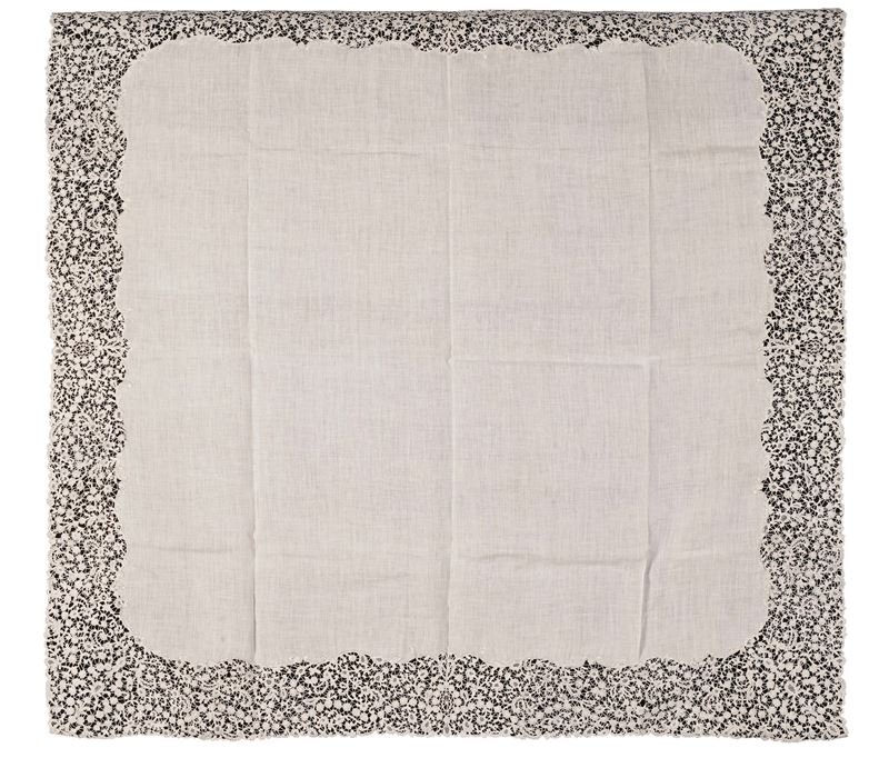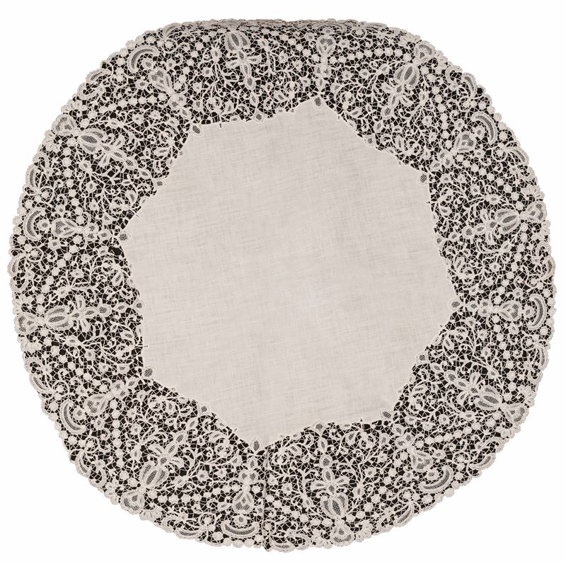 Dimensioni: centrotavola diametro cm 60; tovaglia cm 110x115. Conservazione: ottima;insignificante macchia sul centrotavola