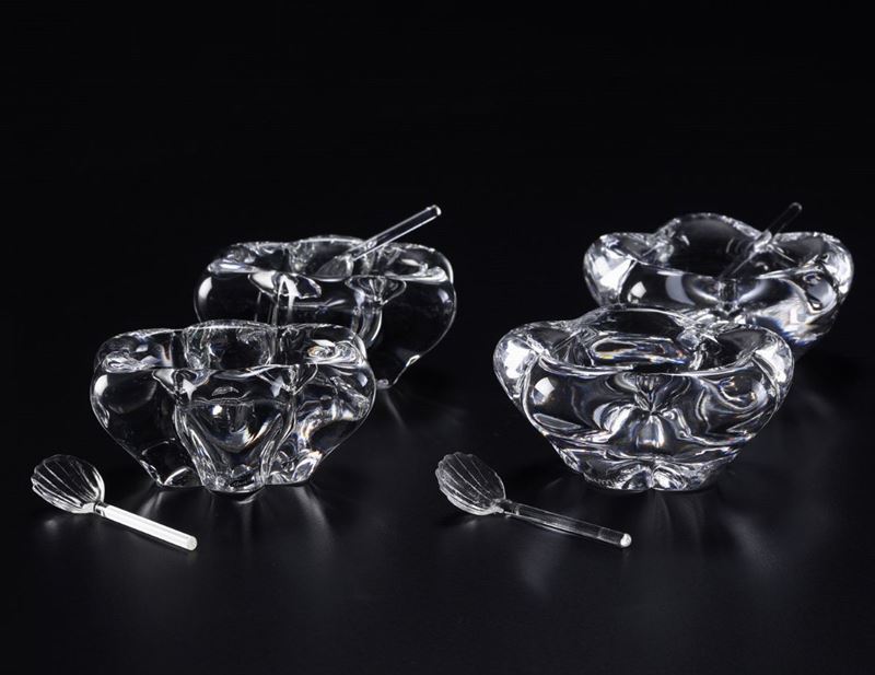 Cristallo. Marca: “Daum France” inciso. Dimensioni: 1 coppia: lunghezza massima cm 6,2; altezza cm 3; 1 coppia: lunghezza massima cm 6,5; altezza cm 3,5. Conservazione: ottima