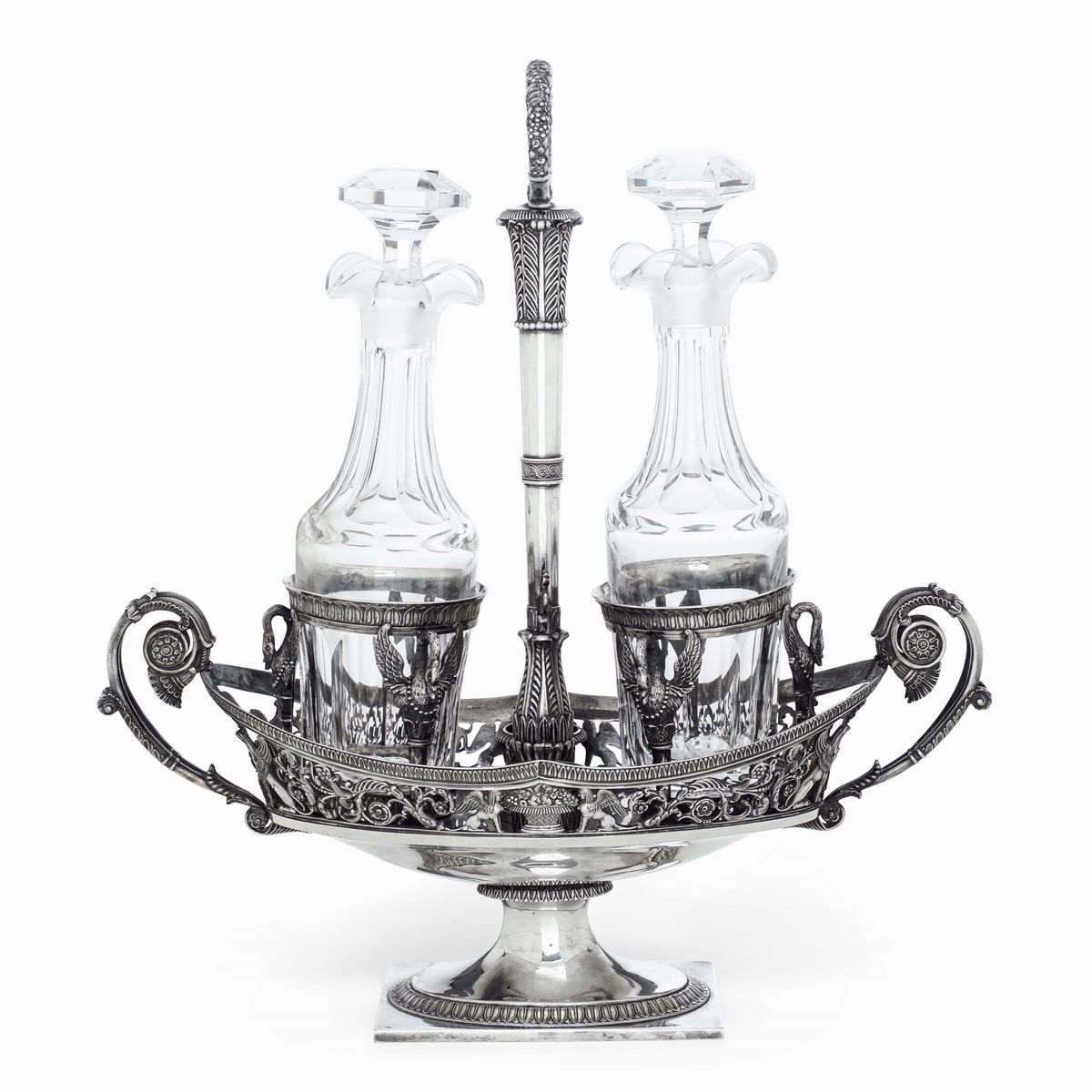 Argento fuso, sbalzato e traforato e ampolle in vetro
