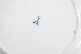 Porcellana. Marca: spade incrociate in blu. Conservazione: qualche sbeccatura sul bordo inferiore dell'alzatina, 1 sbeccatura su un piatto, leggere usure all'oro