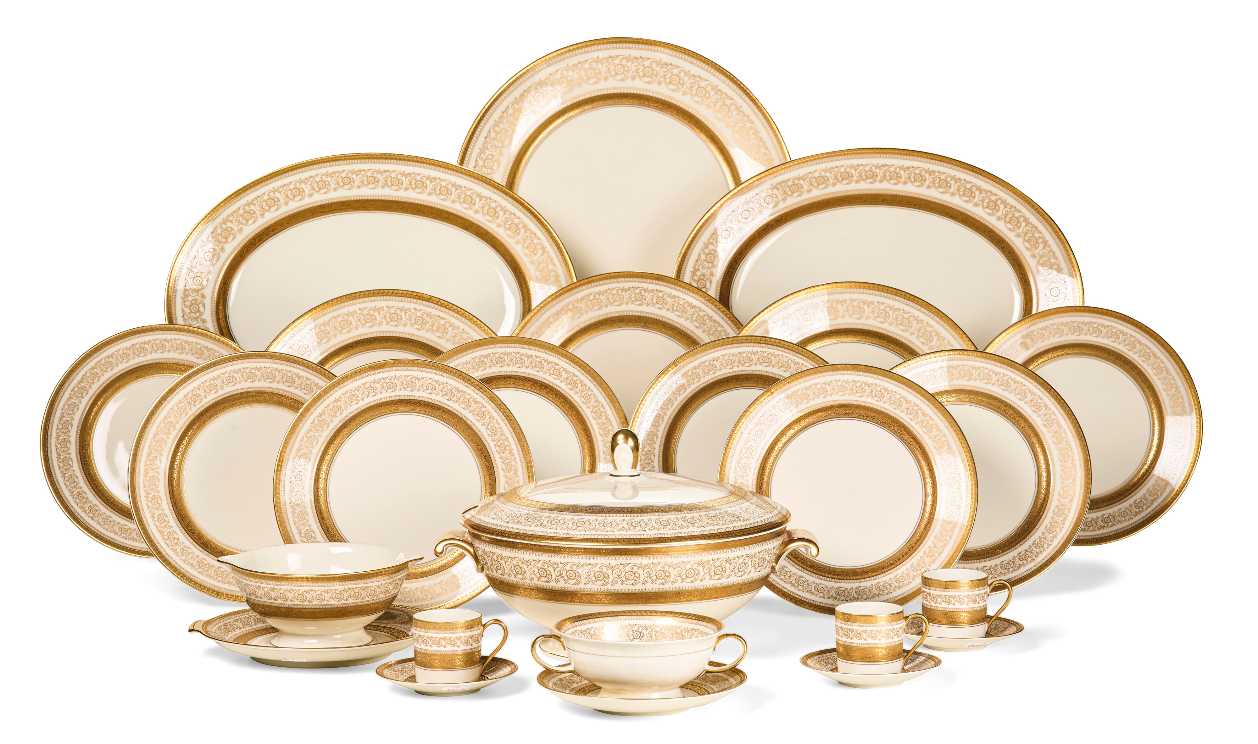 Il design di questo servizio fu creato nel 1937 da Otto Koch e poi decorato nel tempo con vari motivi. Le nostre porcellane ospitano ampi lussuosi nastri in oro