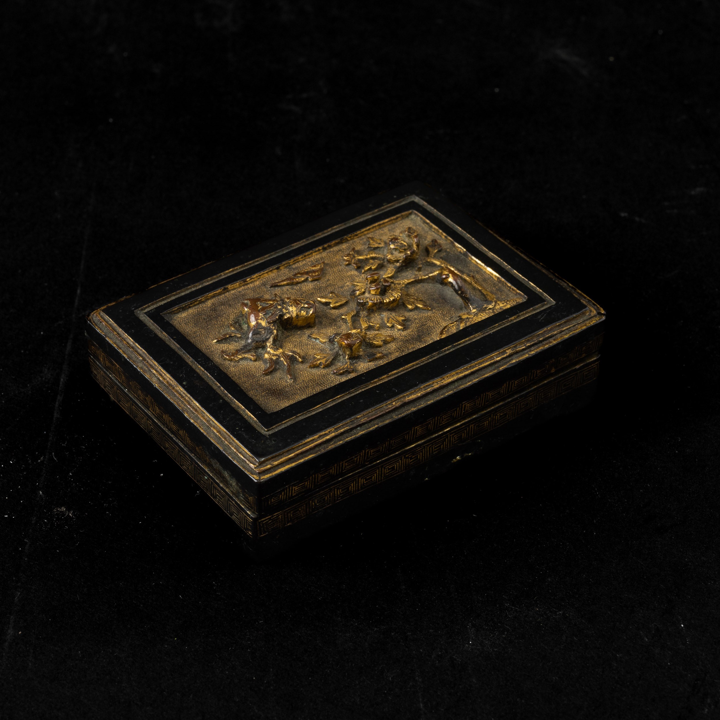 Piccola scatola in bronzo con decoro naturalistico a rilievo sul coperchio, Cina, Dinastia Qing, epoca Qianlong (1736-1796)