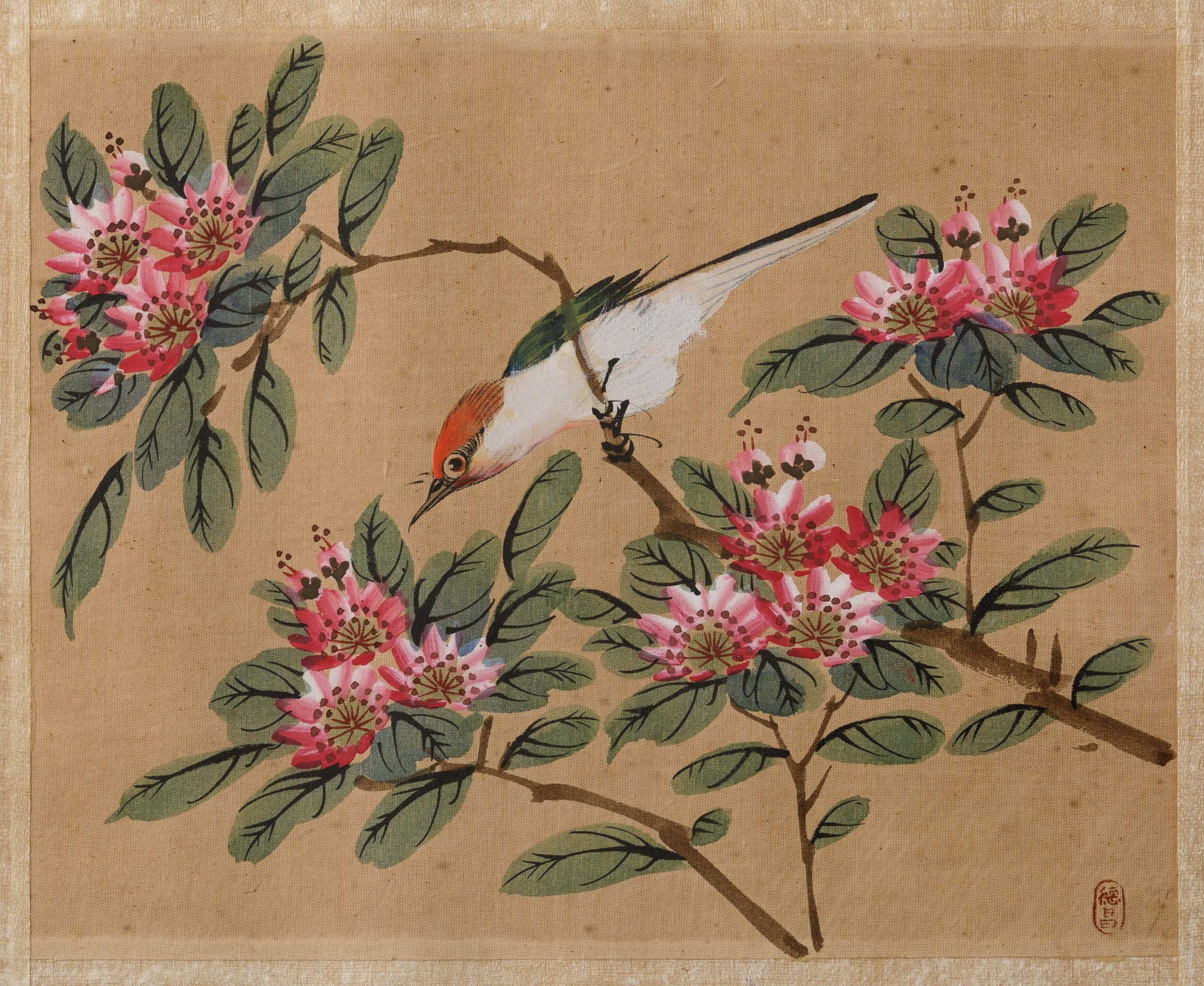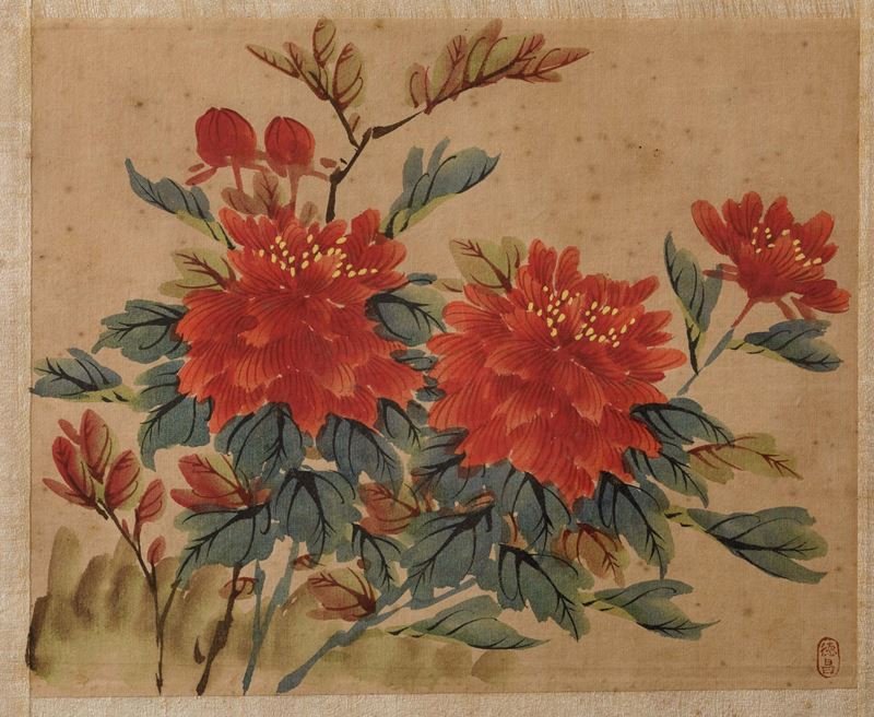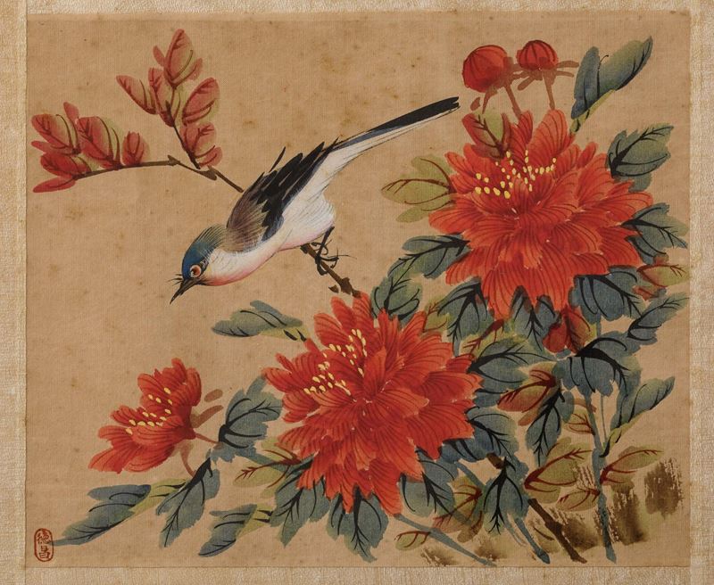 Quattro dipinti su seta raffiguranti soggetti naturalistici con uccellini tra i rami, Cina, XX secolo