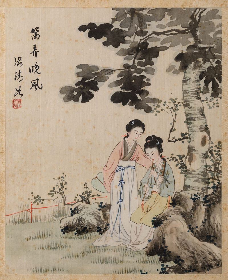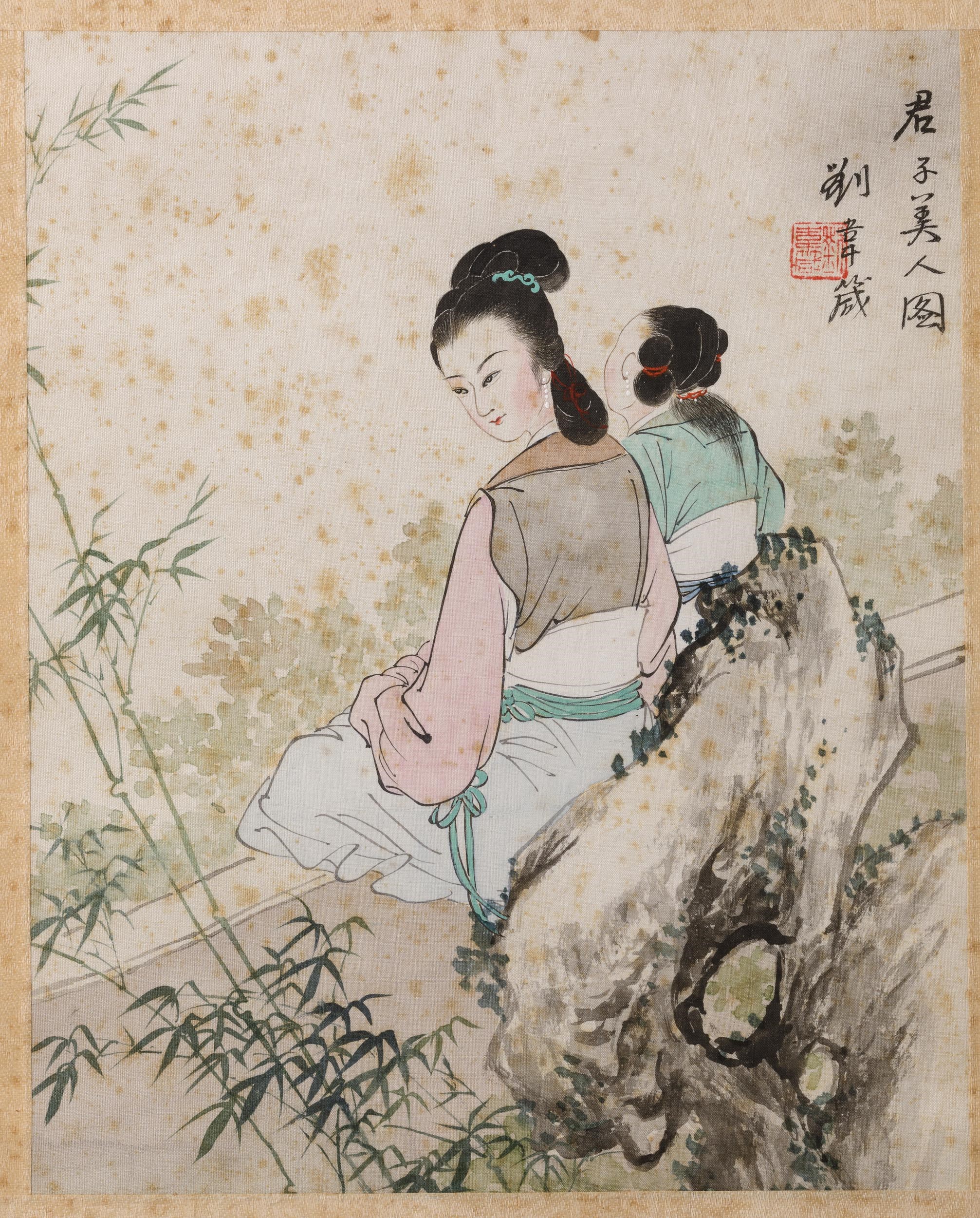Tre dipinti su seta raffiguranti figure femminili con iscrizioni, Cina, XX secolo