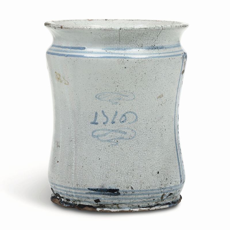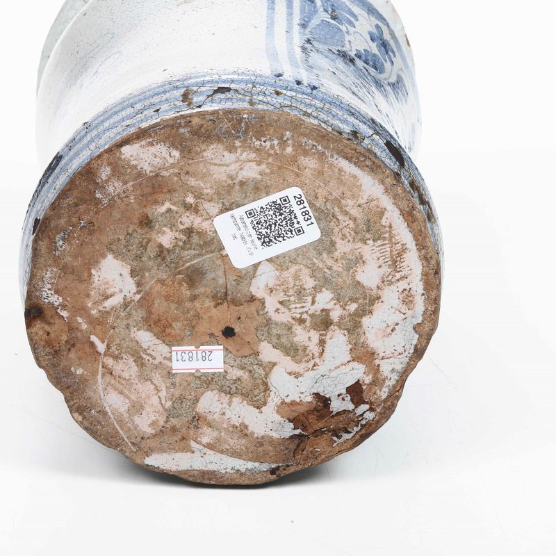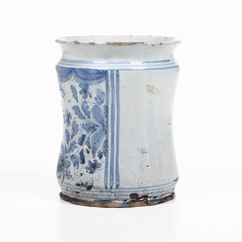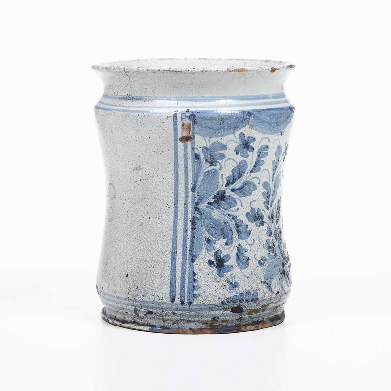 Per un albarello dalla simile tipologia decorativa cfr. G. Donatone, Maioliche napoletane del Seicento, catalogo della mostra Museo Duca di Martina, 1986, p. 75, n. 45