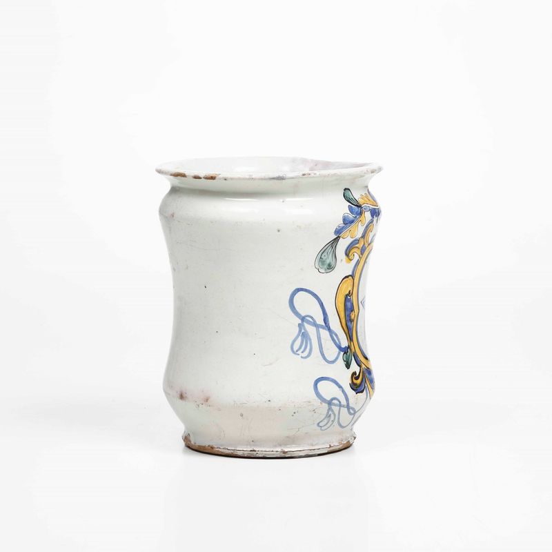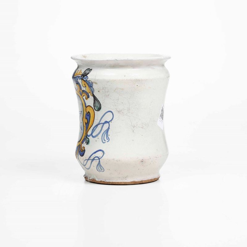 Albarello decorato in policromia con uno stemma con il pentacolo - simbolo magico, consistente in una stella a cinque punte detta anche pantacolo o pantaclo - posto in una "cartouche" dominata da un elmo piumato