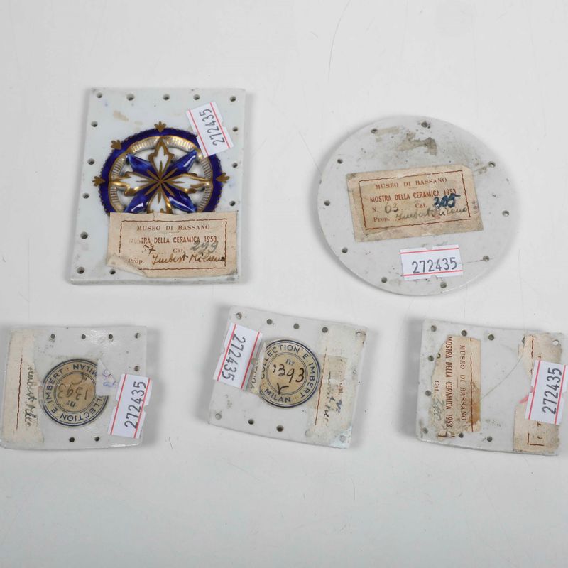 Conservazione: ottima; piccole o insignificanti usure; una placchetta figurata con piccolo restauro ad uno spigolo; la placchetta piccola a fondo blu rotta in due frammenti e rincollata. Sul retro etichette cartacee "Mostra ceramica Bassano 1953"