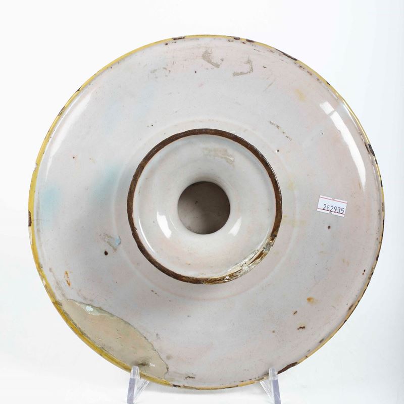 Altezza cm 6,5; diametro cm 27. Conservazione: rottura al bordo tra le ore 5 e le ore 6 integrata; piccole sbeccature ai bordi; piccola mancanza al piede integrata