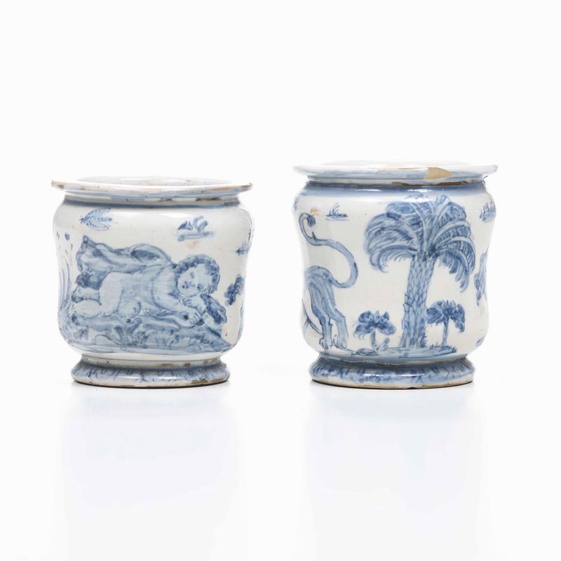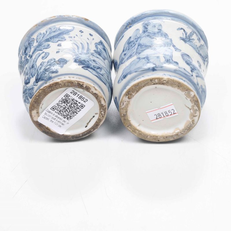 Coppia di rari vasetti da farmacia Castelli, Bottega Pompei o di Carlo Antonio Grue, 1680-1690 circa