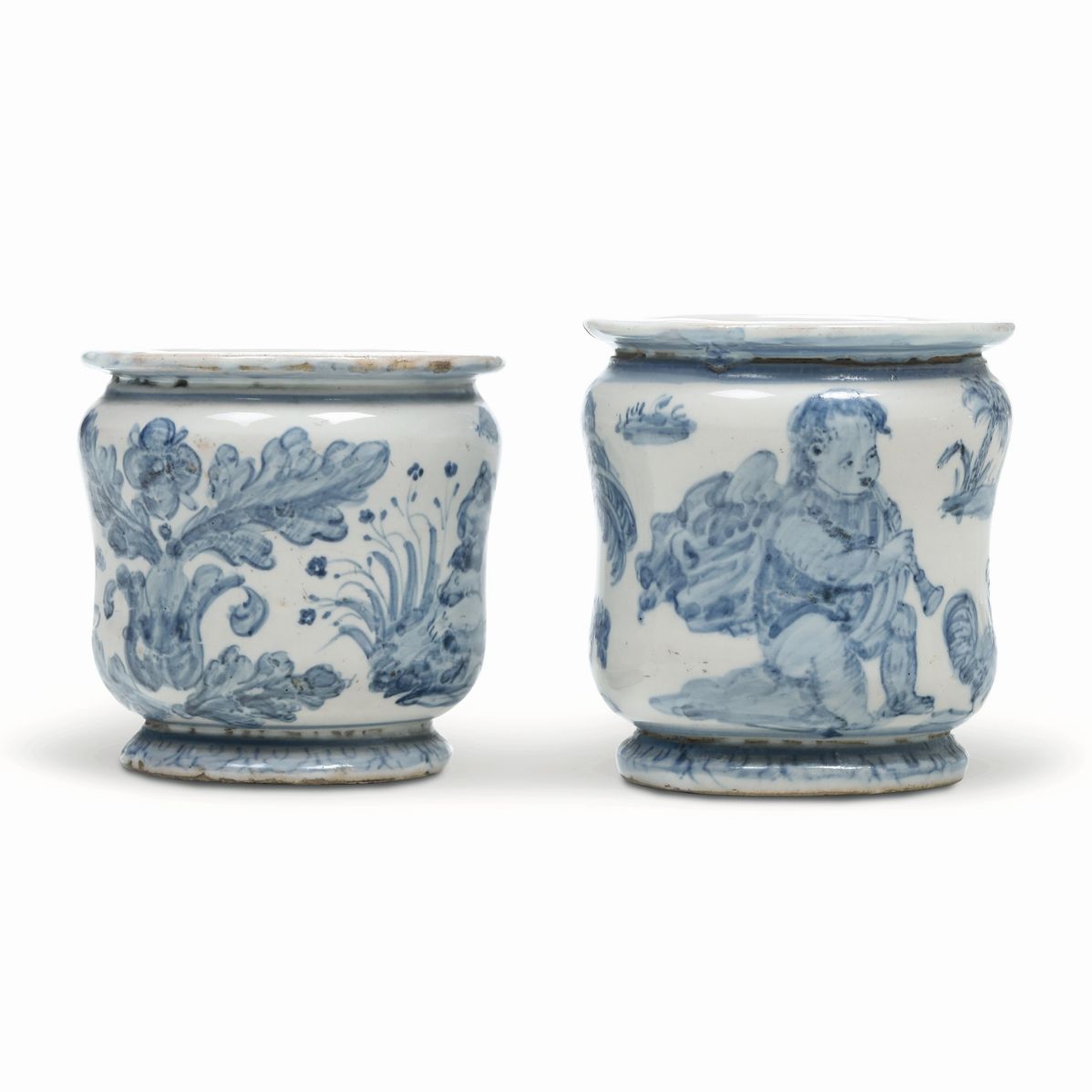 Su ogni piccolo albarello la decorazione in monocromia blu vede, senza soluzione di continuità, un paesaggio formato da piccole zolle a isola dominate da un grande putto, su uno dormiente accompagnato da un cavallo selvaggio, sull’altro intento a suonare un piffero davanti ad un gallo in un paesaggio esotico con palme e un leone intento a salire una scala a pioli. Inoltre edifici ed insetti in volo