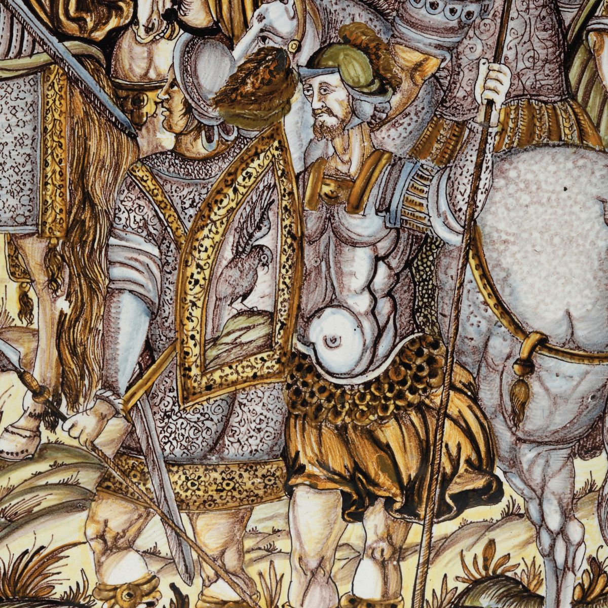 Il soldato di spalle al centro porta uno scudo con lo stemma del committente. Si conoscono altri piatti con la stessa scena, tutti della bottega di Francesco Grue, con lo scudo che riporta lo stemma di diverse casate. Sull’eccezionale tesa, delimitata da una doppia cornice, una fitta decorazione di girali vede elementi sempre differenti con figure ignude, uccelli fantastici, arpie, scudi con mascheroni, vasi monumentali che si susseguono senza soluzione di continuità
