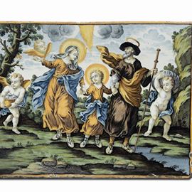 Mattonella decorata con una scena, narrata nella celebre Legenda Aurea di Jacopo da Varagine, del ritorno dalla fuga in Egitto di Gesù bambino con Maria e Giuseppe