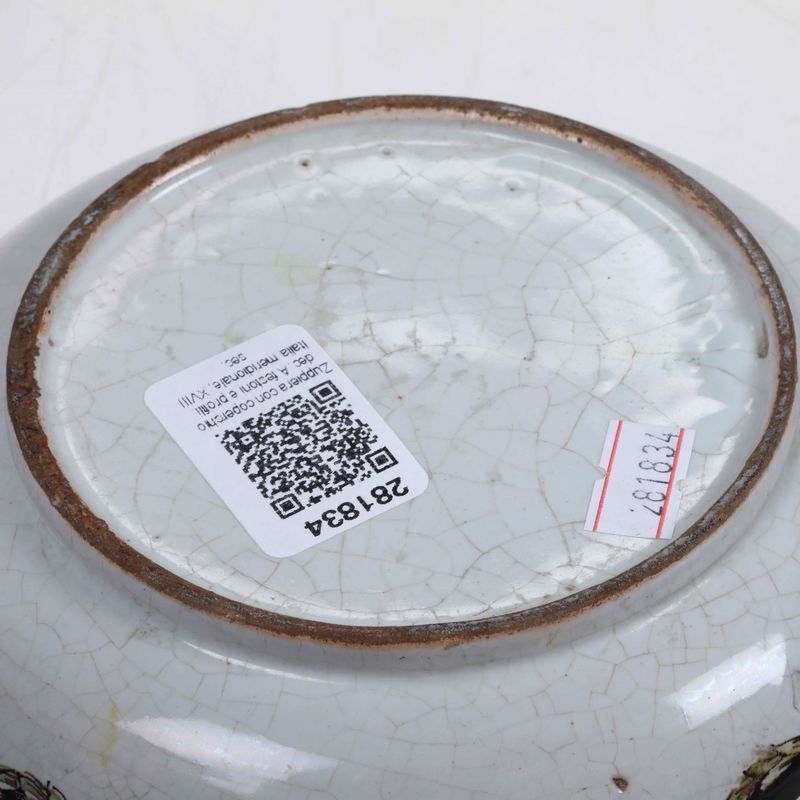 Altezza cm 12,8; diametro massimo 21,5. Conservazione: insignificanti sbeccature ai bordi; piccola mancanza a una foglia della presa