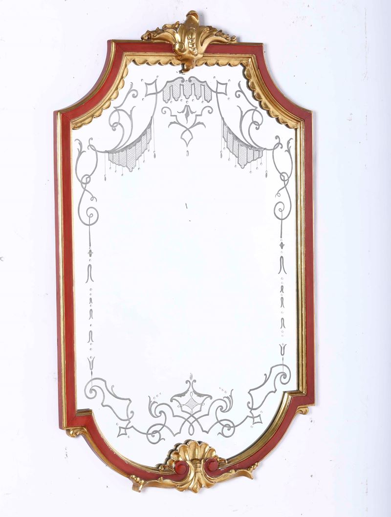 Coppia di specchiere in legno intagliato, laccato e dorato, specchi incisi. XIX secolo