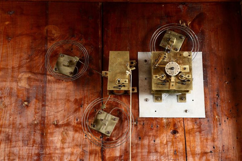 Quadrantino dell'orologio collocato sulla torre di un castello. Le ore sono dipinte con numeri romani, mentre due piccole lancette indicano l'ora.