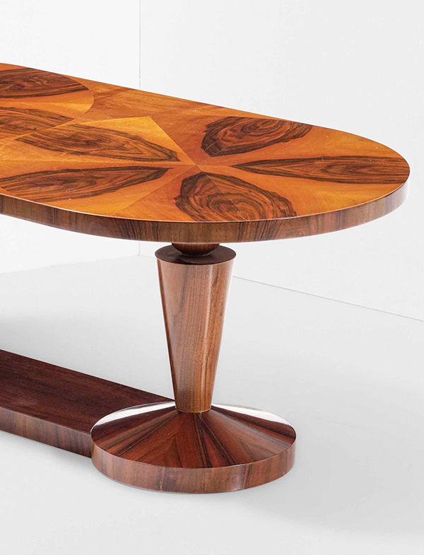 Struttura in legno e legno scolpito, piano in legno impiallacciato a configurazione geometrica. Prod. Valabrega, Italia, 1940 ca.