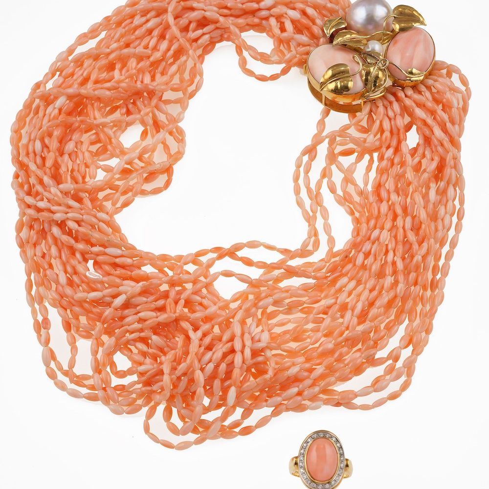 Pink coral and pearls necklace and ring