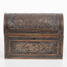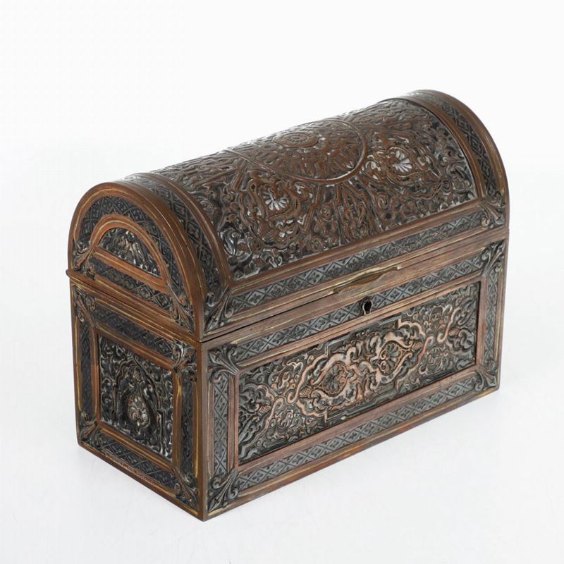 Bauletto da tavolo in lamina di rame argentato. Spagna, fine XIX, inizi XX secolo
