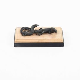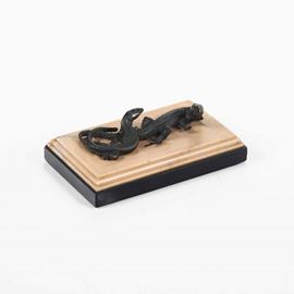Piccolo gruppo, due lucertole in bronzo fuso e rifinito al bulino e cesello, patina bruna. XIX secolo.