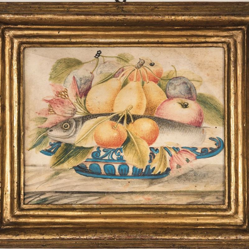 Nature morte con canestre di frutti e pesce