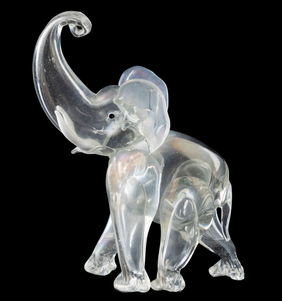 Large blown glass elephant with tusks and lattimo eyes. Fully iridescent surface.