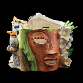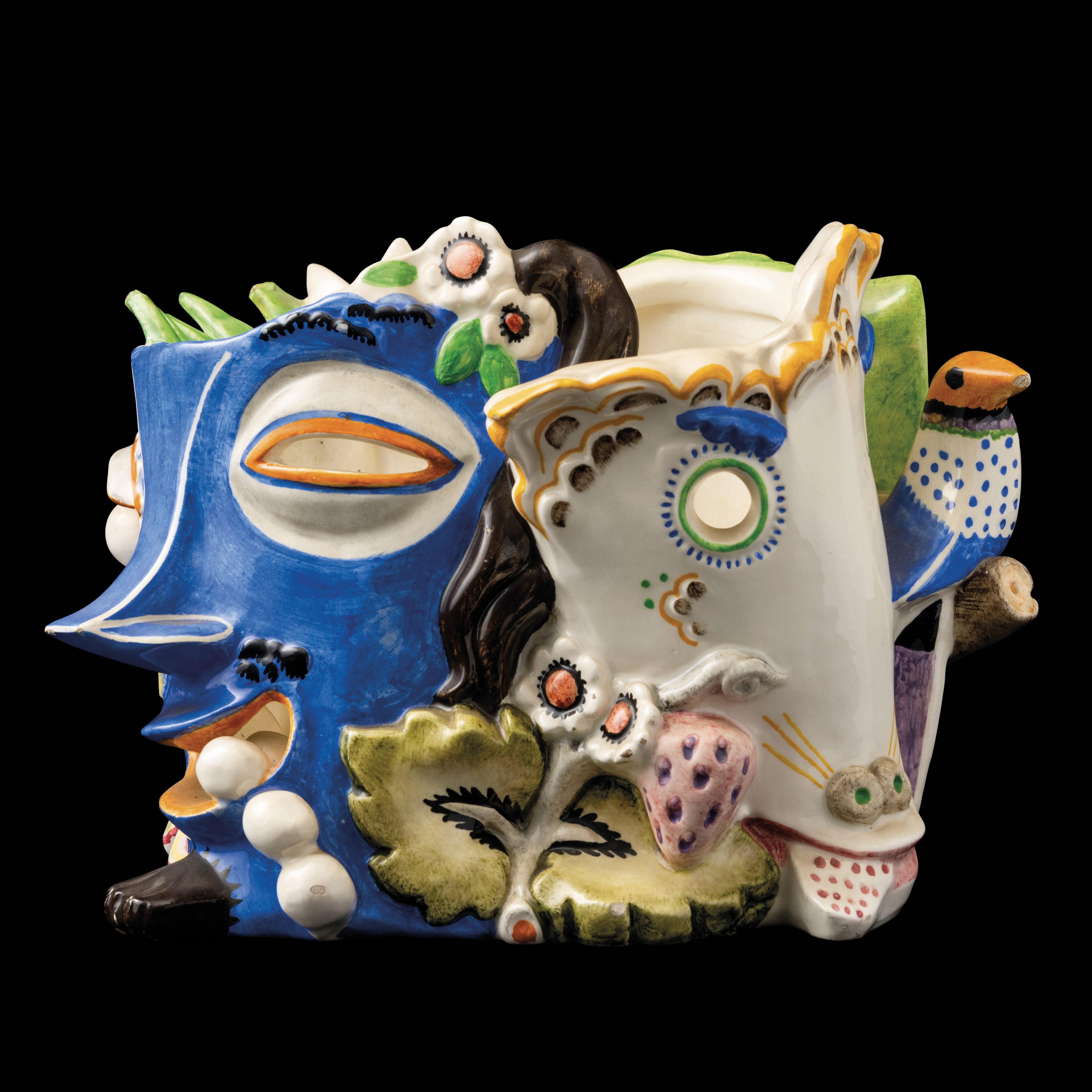 Cast earthenware centerpiece depicting masks with polychrome floral decoration in futurist taste.