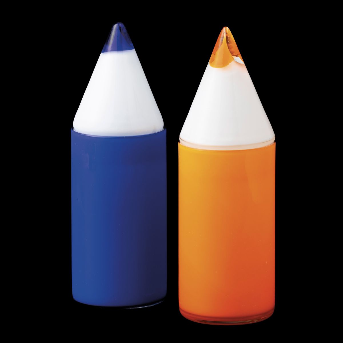 Pair of cylindrical boxes with lids in the shape of multicolored sommerso glass pencils.