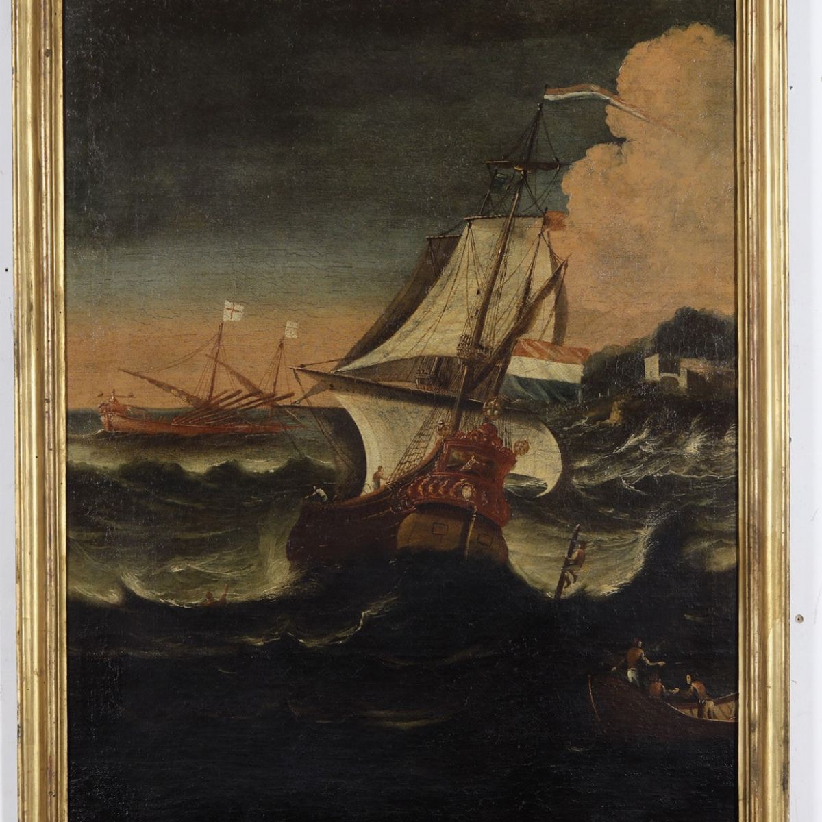 Scuola del XVIII secolo Marina in tempesta con imbarcazioni