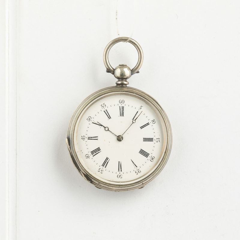 Lotto di due orologi del 1870 circa con casa in argento, movimenti con scappamento a cilindro, carica a chiavetta, quadranti in smalto bianco.
